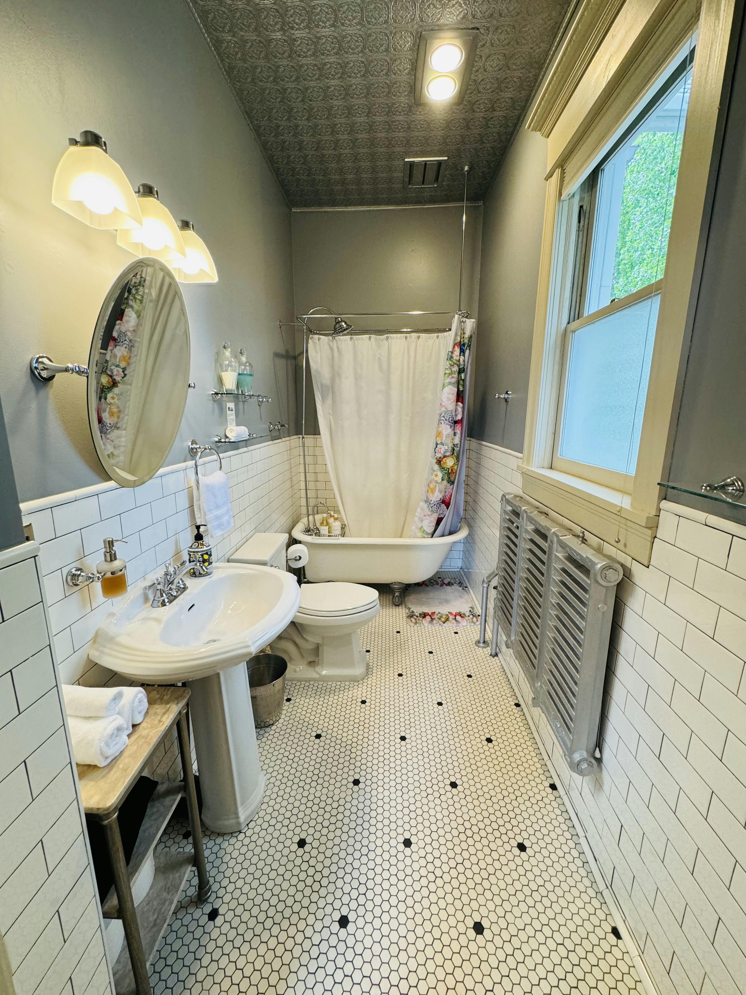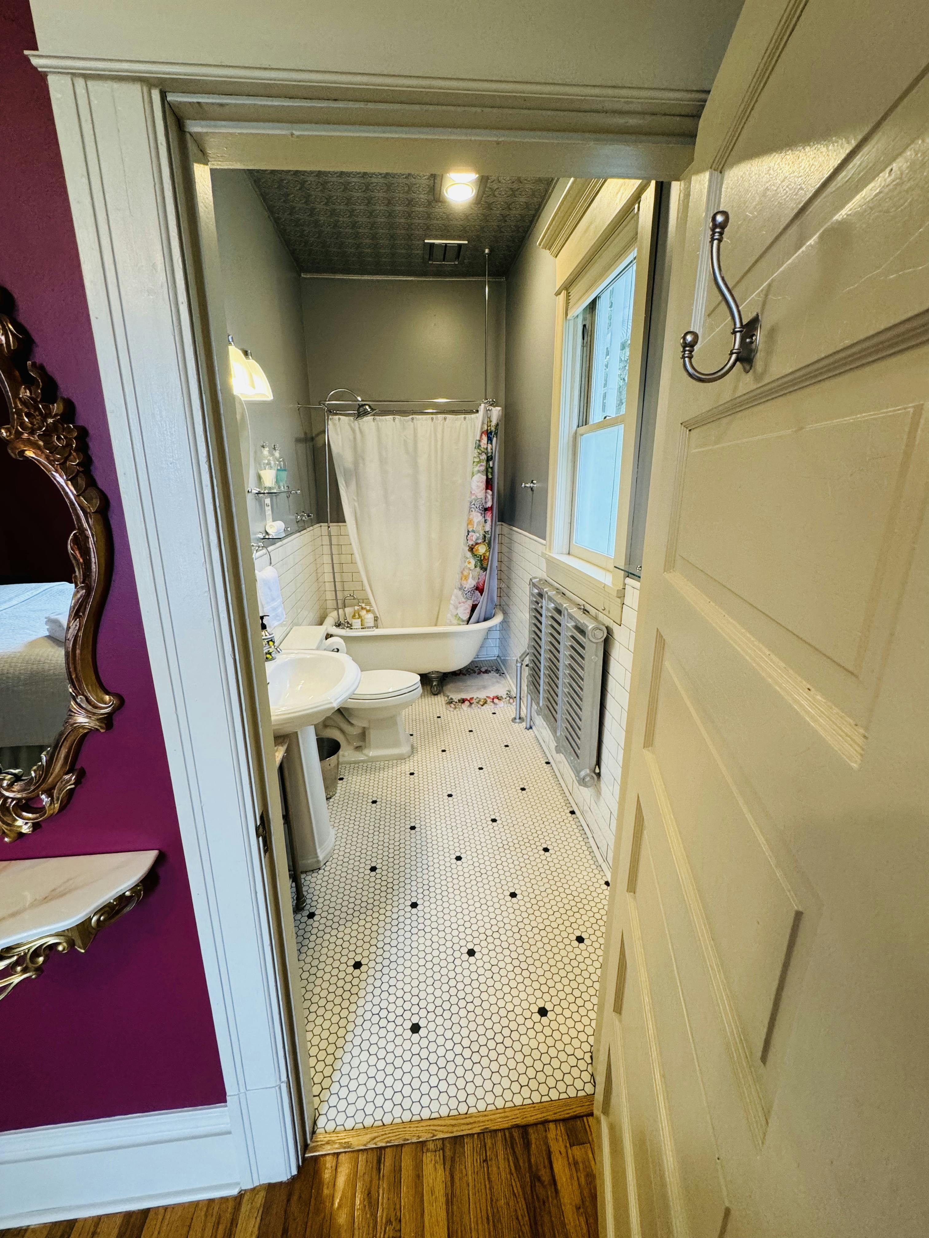 The private bathroom is a highlight, showcasing a classic claw-foot tub perfect for indulgent soaks. Modern fixtures, soft towels, and premium toiletries complete the bathroom, ensuring a luxurious and relaxing experience.